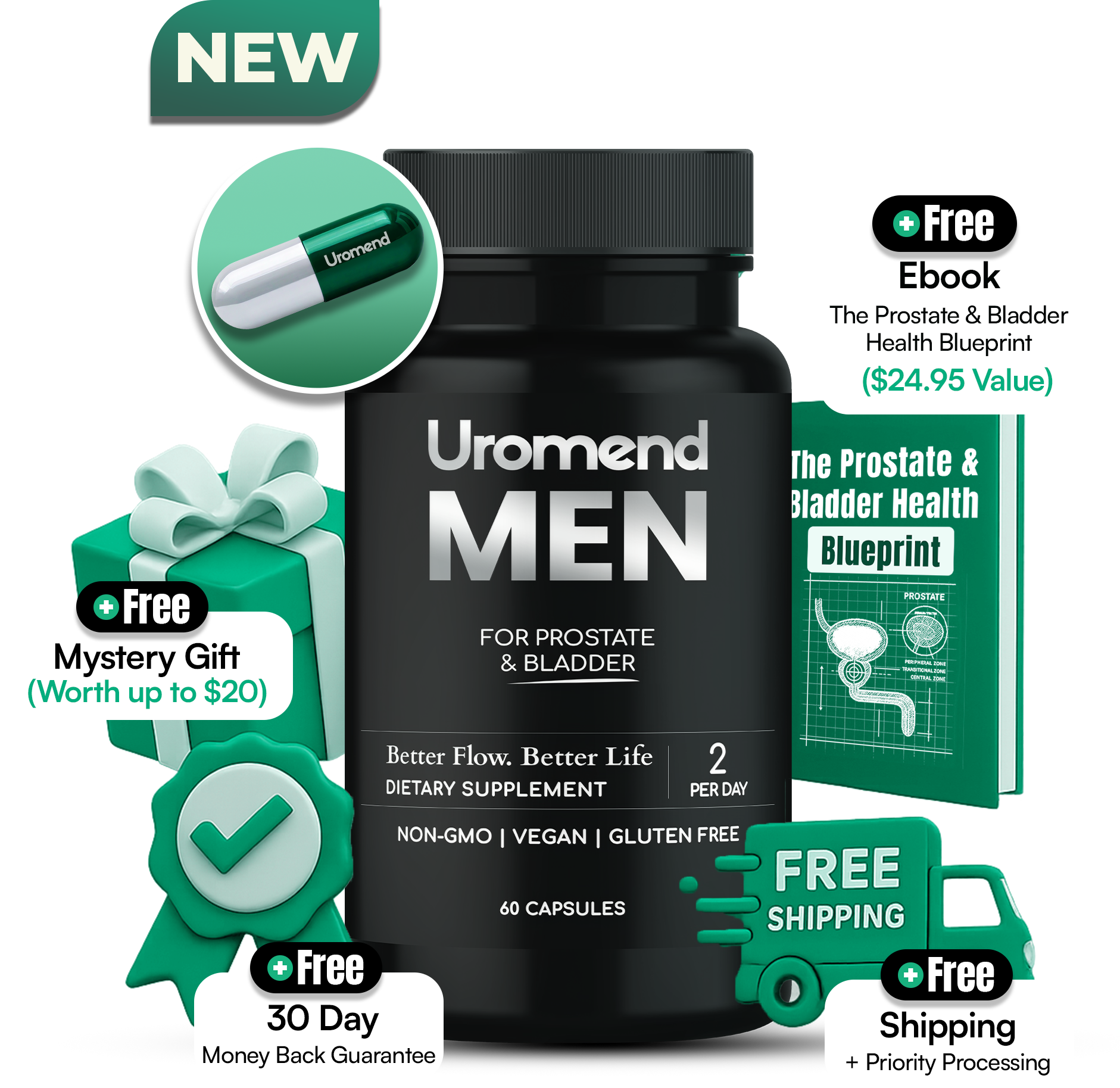 Uromend is a 6-in-1 premium prostate and bladder support formula designed to target urinary flow, bladder control. Unlike other supplements that focus on a single ingredient like Beta-Sitosterol, Uromend combines Pumpkin Seed Oil, Saw Palmetto, Reishi Mushroom, Beta-Sitosterol, Stinging Nettle Root, and Turmeric Root Extract—clinically studied ingredients that support bladder health, urinary function, and inflammation relief.